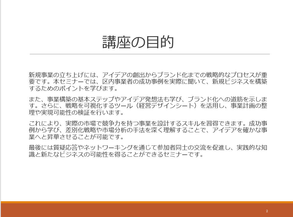 株式会社ネモファーの根本様をゲストスピーカーに招いて、新たな事業、新商品開発を行う際のポイントである、ニーズ、リスクなどを講義。