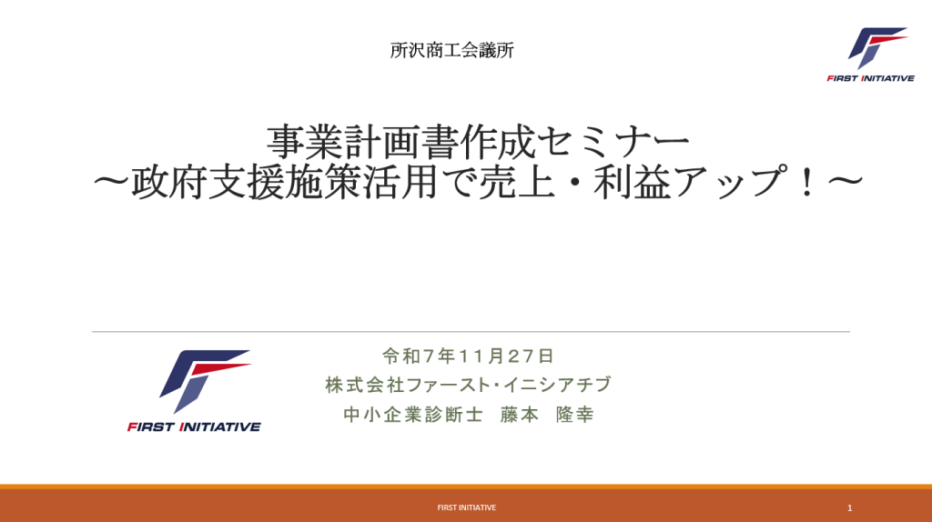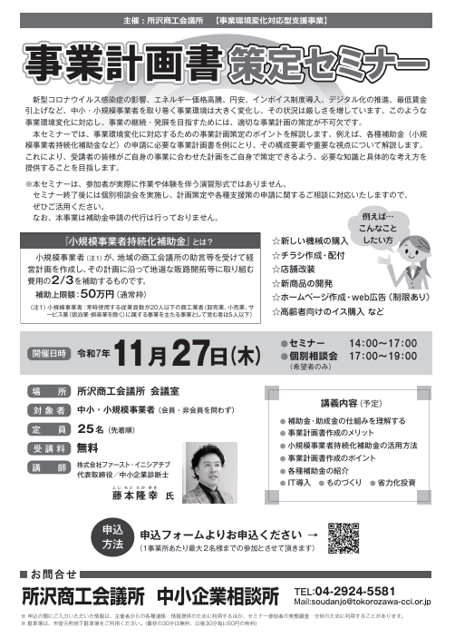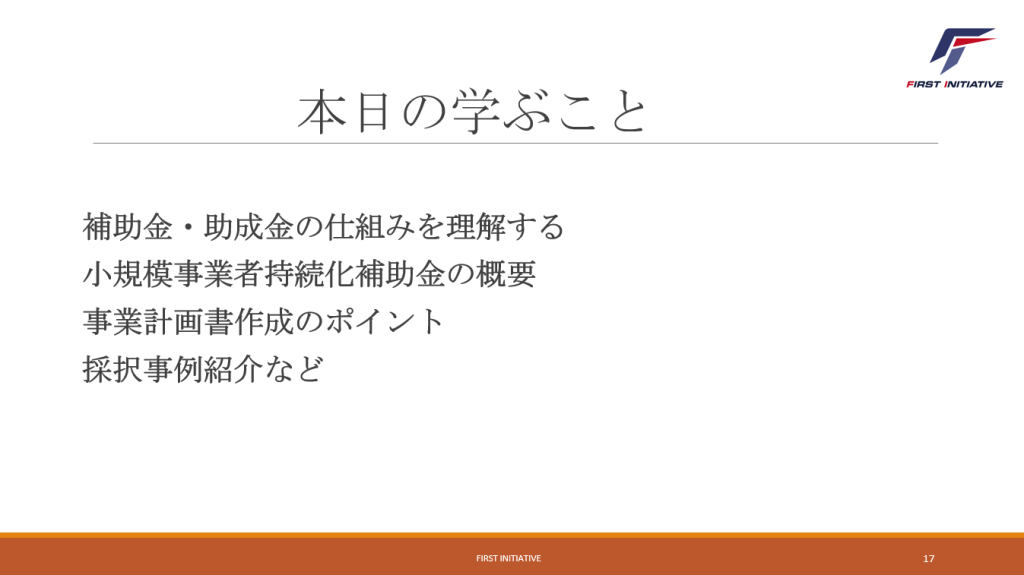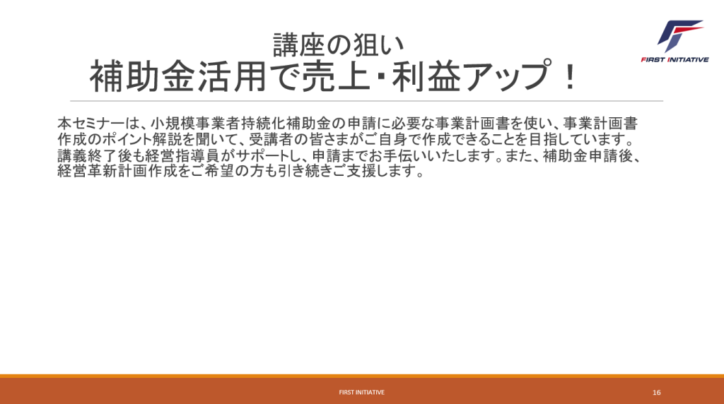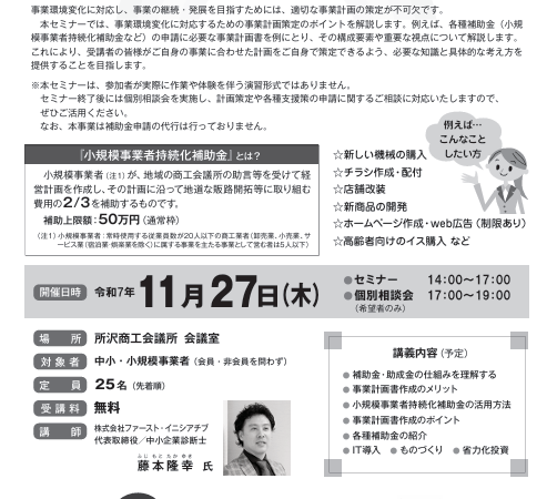 小規模事業者持続化補助金、ものづくり補助金、省力化補助金などについて概要を説明するとともに、補助金申請に必要となる前段としての経営計画の考え方と策定方法について説明。